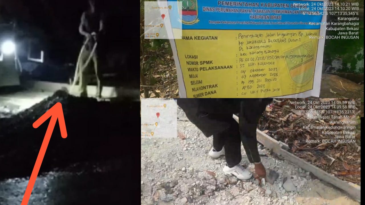 Bekasi, – Kemajuanrakyat.id Kegiatan peningkatan Jalan Lingkungan (Jaling) Bapak Juanda tepatnya, di Kampung Jarakosta, RT 003 RW 003, Dusun I Desa Karangmukti, Kecamatan Karang Bahagia, Kabupaten Bekasi, Jawa Barat, yang dikerjakan oleh CV. UKI PUTRA JAYA diduga asal-asalan tidak memikirkan kualitasnya, Rabu (25/10/2023).