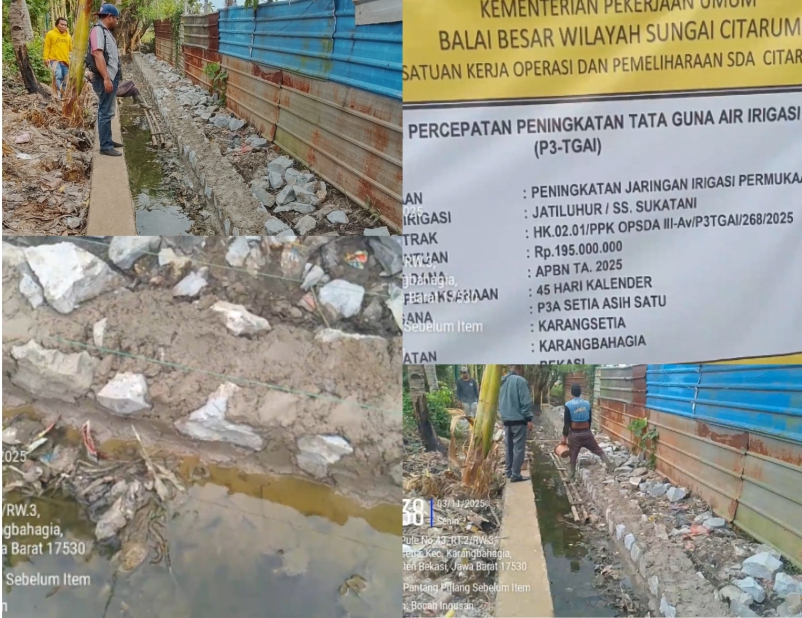 Temuan pada kegiatan P3A–TGAI yang dilaksanakan oleh Kelompok P3A Setia Asih Satu, Desa Karangsetia, Kecamatan Karang Bahagia, Kabupaten Bekasi, dengan pagu anggaran Rp195 juta. Berdasarkan pantauan tim media dan DPD LSM Prabhu Indonesia Jaya, sejumlah kejanggalan ditemukan, antara lain dugaan galian pondasi yang tidak sesuai spesifikasi, penggunaan material berkualitas rendah, serta pekerja mengabaikan keselamatan kerja (K3) dan Alat Pelindung Diri (APD).